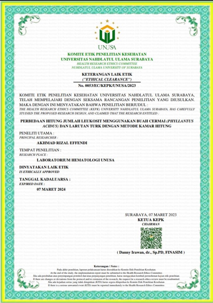 Differences In Counting The Number of Leukocytes Using Cermai Fruit (Phyllantus acidus) Juice and Turk Solution Using The Counting Room Method